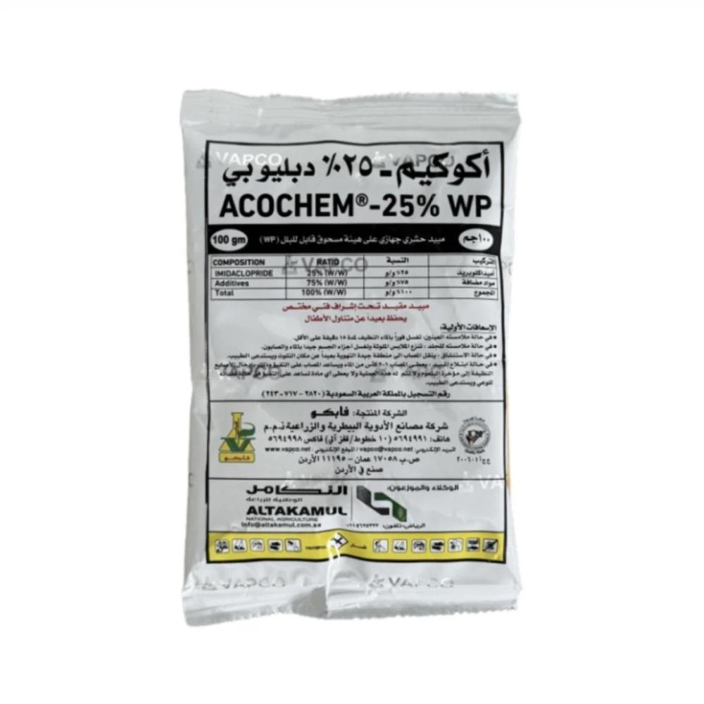 اكواكيم 25% دبليو بي 100 جرامأكوكيم مبيد حشري علي شكل مسحوق يمكن تبليله (WP) ويؤثر عن طريق الاتصال والابتلاع، ويحتوي على المادة الفعالة ايميداكلوبريد لمكافحة العديد من الحشرات الثاقبة الماصة التي تؤثر على الخضروات والمحاصيل الحقلية داخل المنازل المحمية. يمكن خلطه مع مجموعة من المبيدات الحشرية، ويجب رشه مباشرة بعد الخلط.يستخدم في مكافحة الحشرات والآفات مثل الذباب الأبيض والعث، بناءً على حاجة مكافحة صانعي الأنفاق والحشرات المغذية على الأوراق والقشريات التي تؤثر على النباتات المحمية داخل البيوت.المادة الفعالة: ايميداكلوبريد 25%الوزن 100 جرامطريقة الأستخدامضع من 30 إلى 45 جرامًا لكل لتر من الماء للحشرات المنزلية.ضع بمعدل يتراوح بين 30 إلى 45 جرام لكل 100 لتر ماء الحشرات الزراعية.تنبيه: بعض النباتات الزينة يمكن أن تكون حساسة للمبيدات الحشرية، لذلك يجب إجراء تجربة صغيرة لفحص الحساسية.