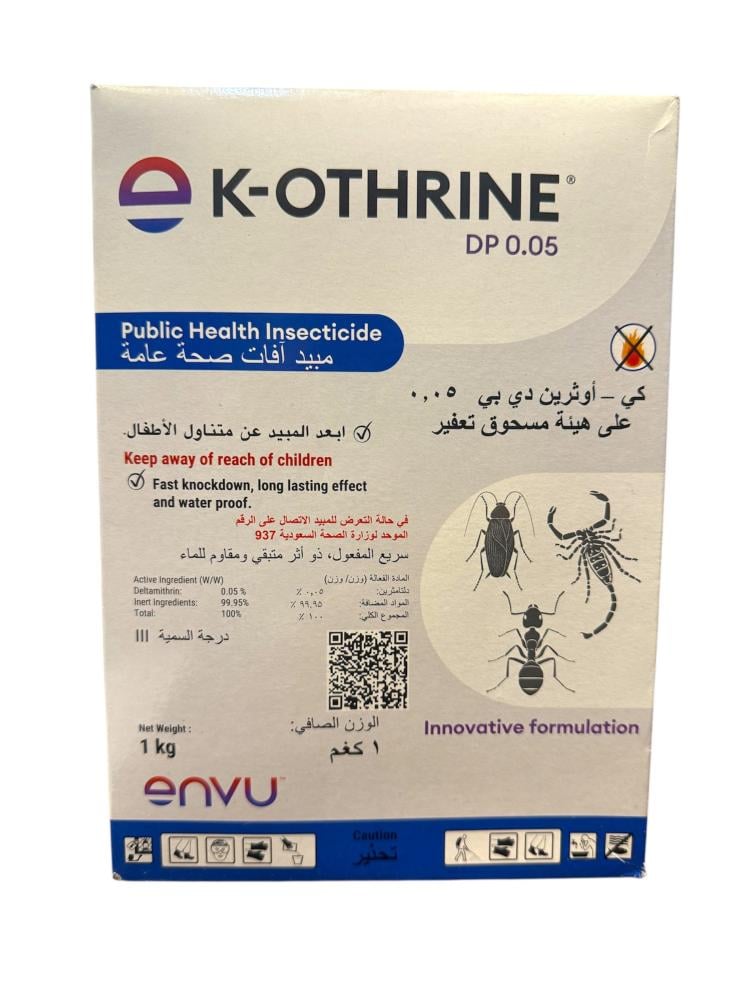 كي أوثرين دي بي عبارة عن مسحوق تعفير جاهز للاستخدام كمبيد للحشرات، تم تصنيع هذه المواد من مجموعة البيروثريدات المقاومة للماء. يحتوي على المادة الفعالة دلتامثرين التي تعمل عن طريق الملامسة والهضم.