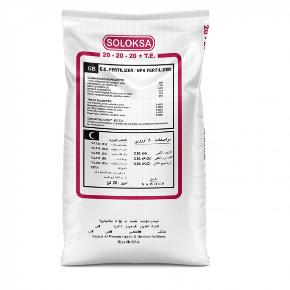 تركيبة متعددة الأغراض للنمو العام مع نسبة عناصر متوازنة 1: 1: 1. تم إنتاجه من أجود وأنقى المواد الخام مع العناصر الصغرى المخلبية لضمان سرعة الامتصاص و الفعالية العالية. سماد مثالي للاستخدام في ظروف الملوحة العالية ( الأراضي ومياه الري).سماد متجانس ، انسيابي ، على شكل مسحوق بلوري ناعم.